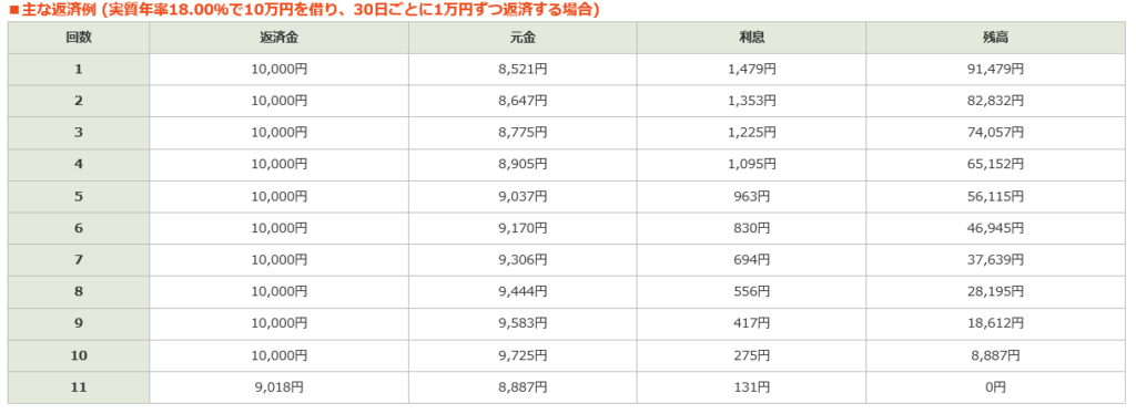 ◆10万円をお借入して頂き、30日ごとに1万円ずつの返済だと、11回支払いになります。